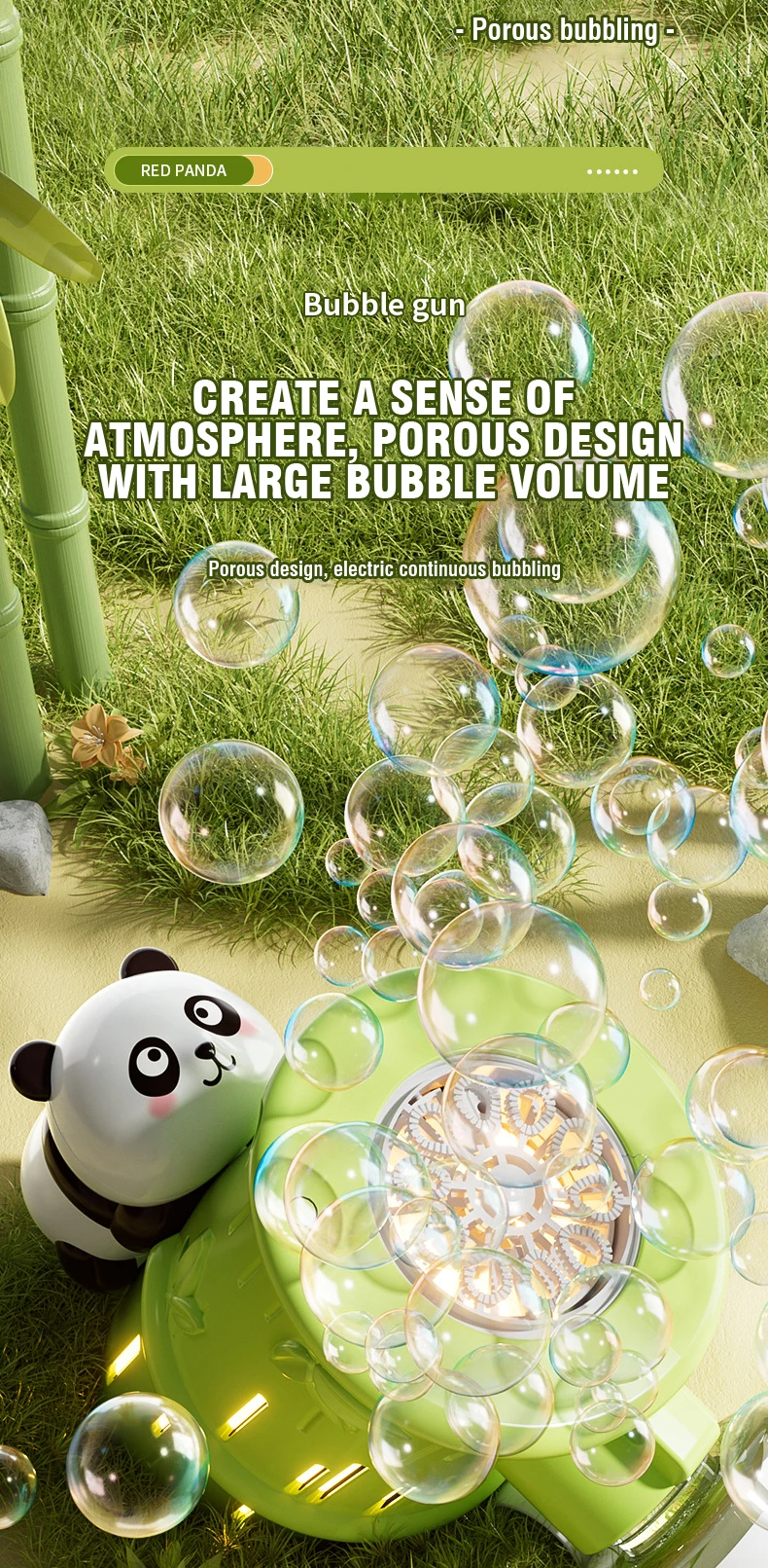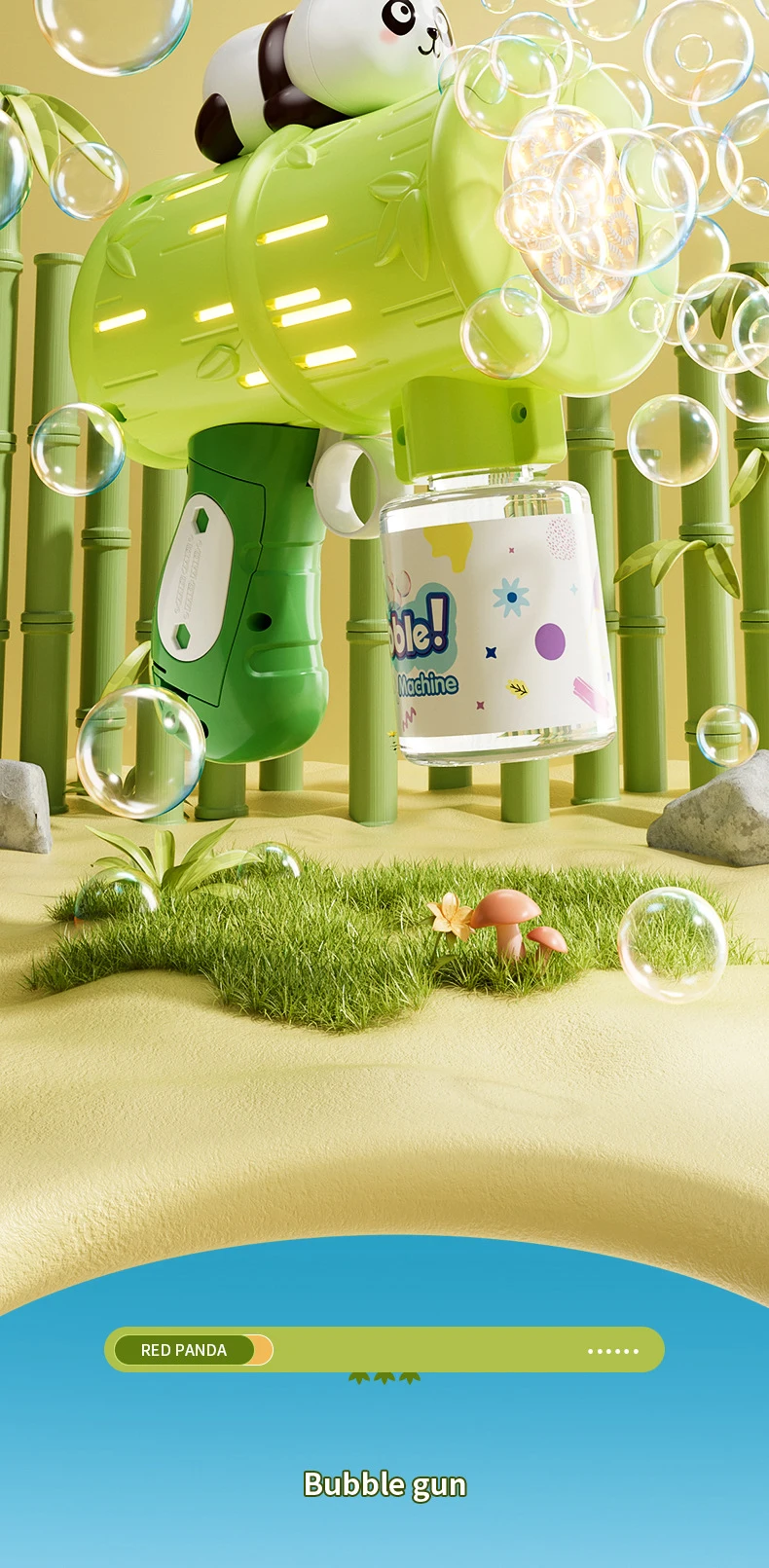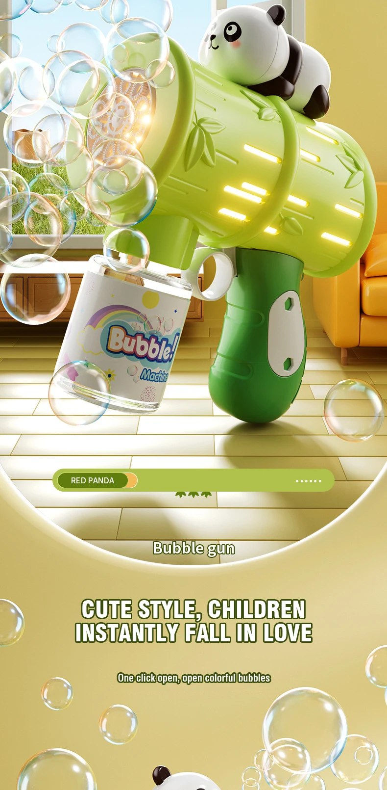 - The bubble gun features a cute and engaging panda design that kids will love. Its playful appearance makes bubble blowing even more enjoyable for children.