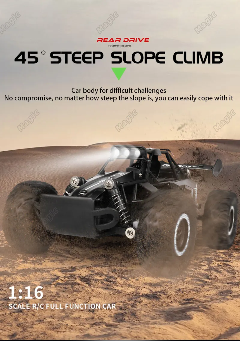 This 1:16 scale RC car features 2WD and LED lights, achieving speeds up to 20KM/H. Designed for high-speed off-road climbing, it operates on a 2.4G frequency for precise control. Perfect for boys, girls, and kids, this remote control car offers thrilling outdoor fun.