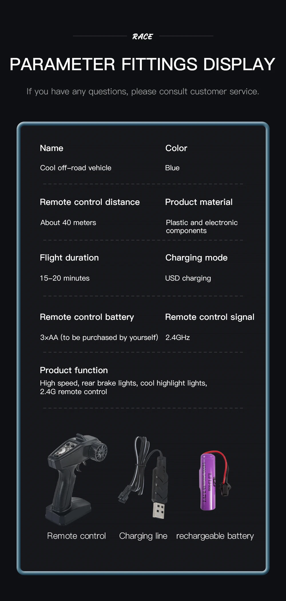 1. If you can't find the battery after receiving the package, please check the battery compartment of the toy car first;