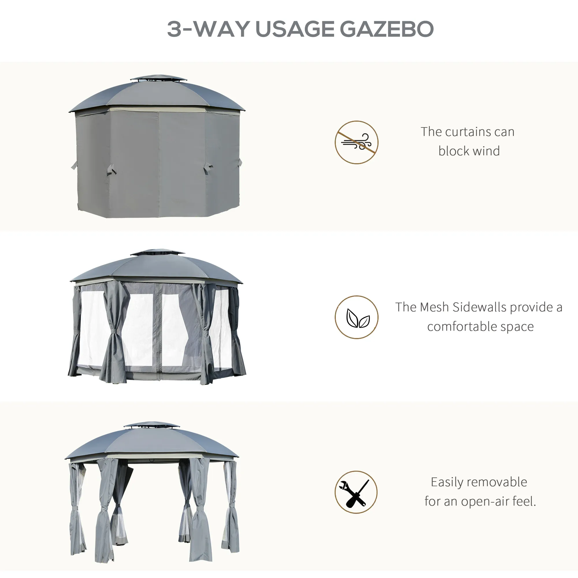Whether you prefer a permanently shaded seating area, a semi‑enclosed lounge with curtains, or a fully screened space for outdoor dining, the gazebo’s design allows for customization. You can adapt it to suit different climates, seasons, and personal preferences.