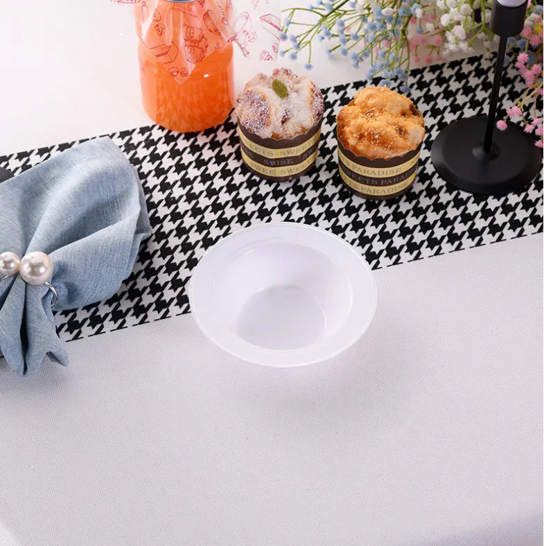 Made from hard plastic PS, these bowls are strong and durable, offering the reliability of traditional tableware with the convenience of disposability. Despite being disposable, the material is tough enough to handle heavier foods and sauces without bending or leaking. These bowls are designed to hold their shape and provide a sturdy, reliable vessel for a variety of dishes.