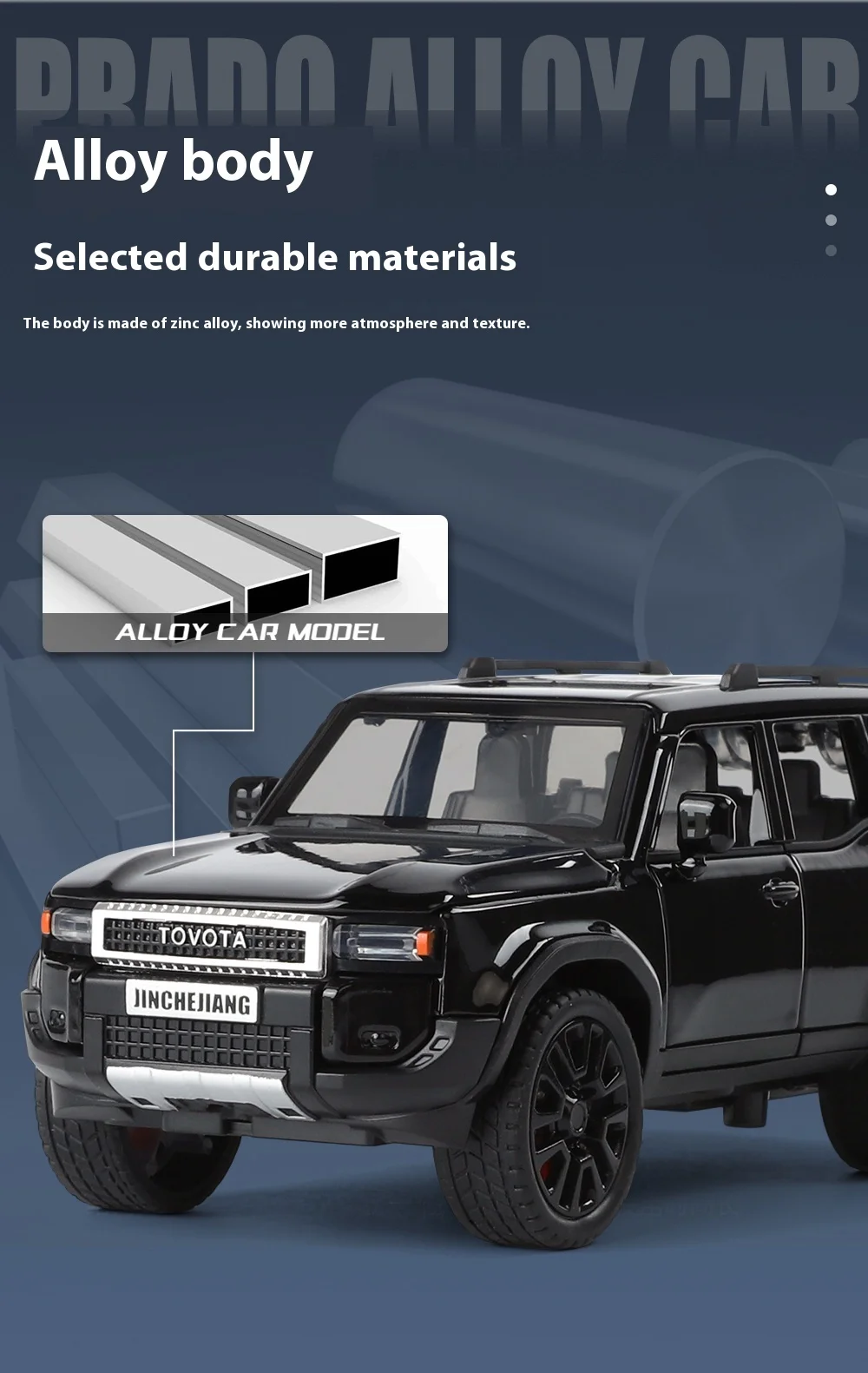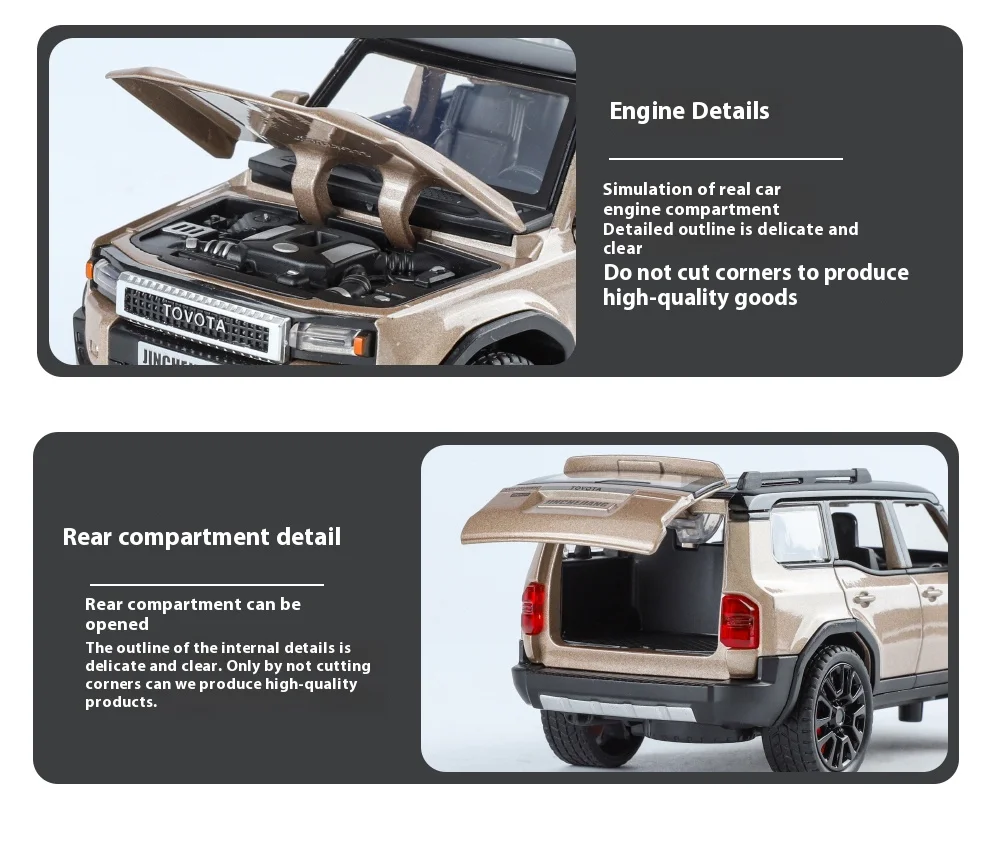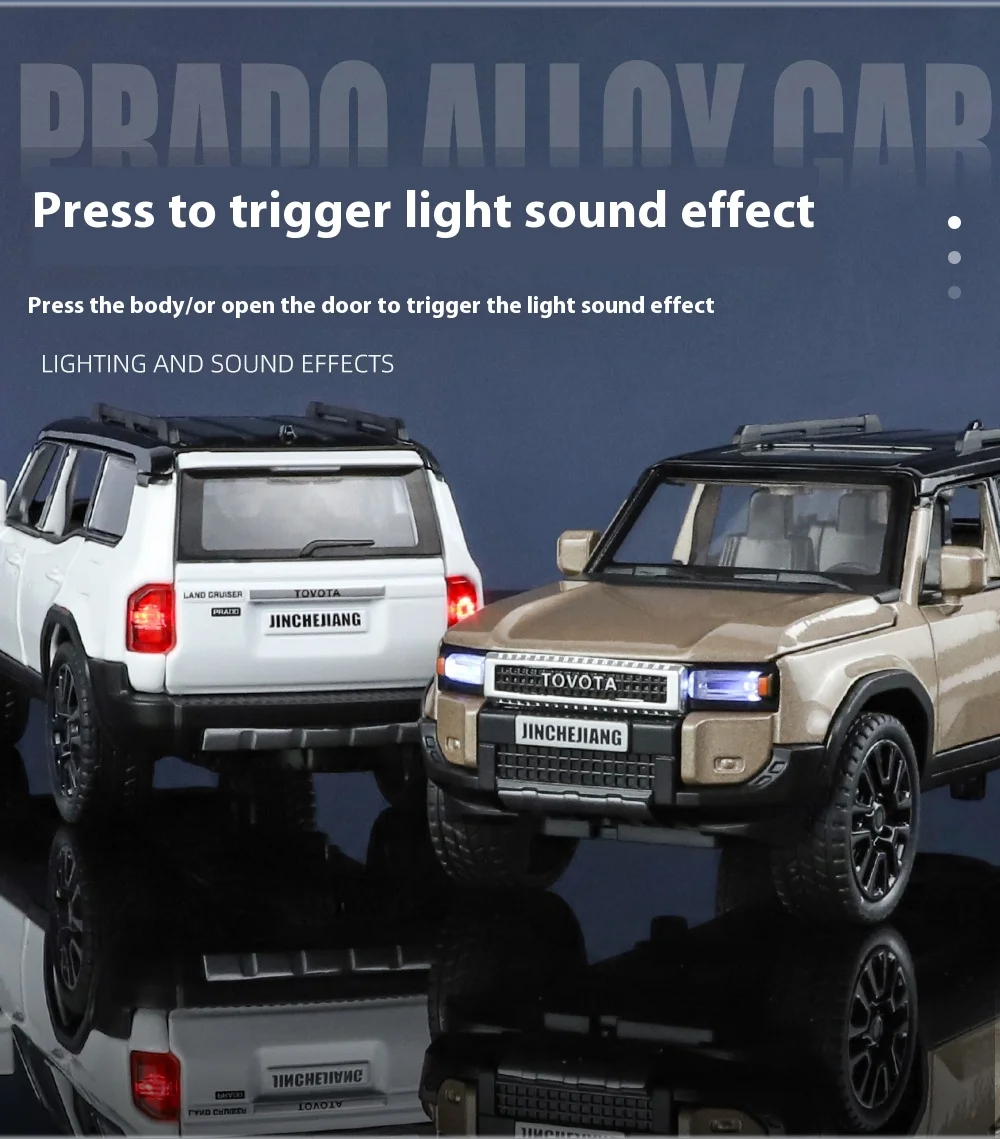 The 1:32 Toyota Prado Land Cruiser diecast model stands out for its exceptional realism. Every aspect of the vehicle has been faithfully recreated, from the texture of the alloy body to the small details like the chrome grille and sleek headlights. The attention to detail ensures that this model car offers an accurate representation of one of the most iconic off-road vehicles in automotive history.