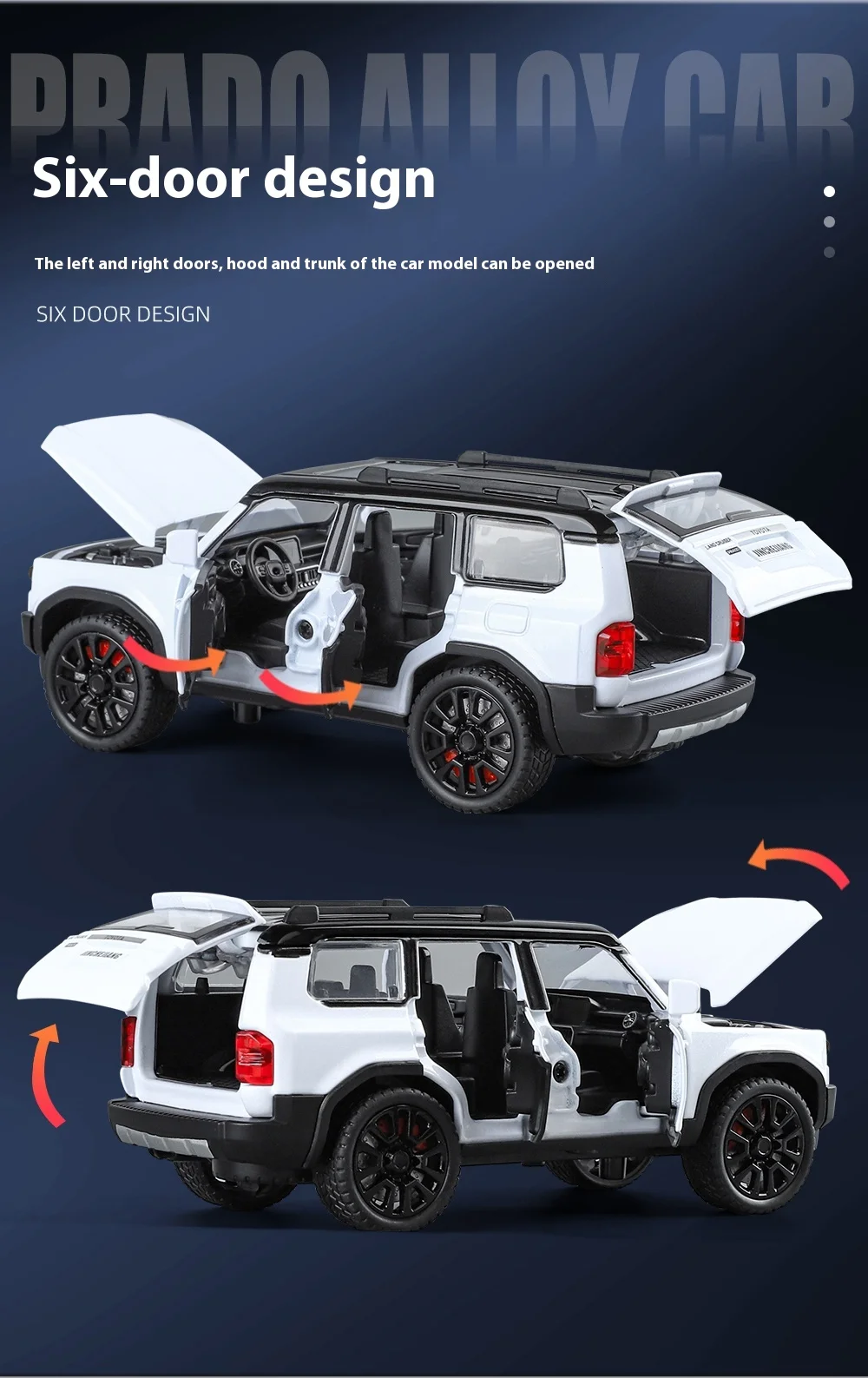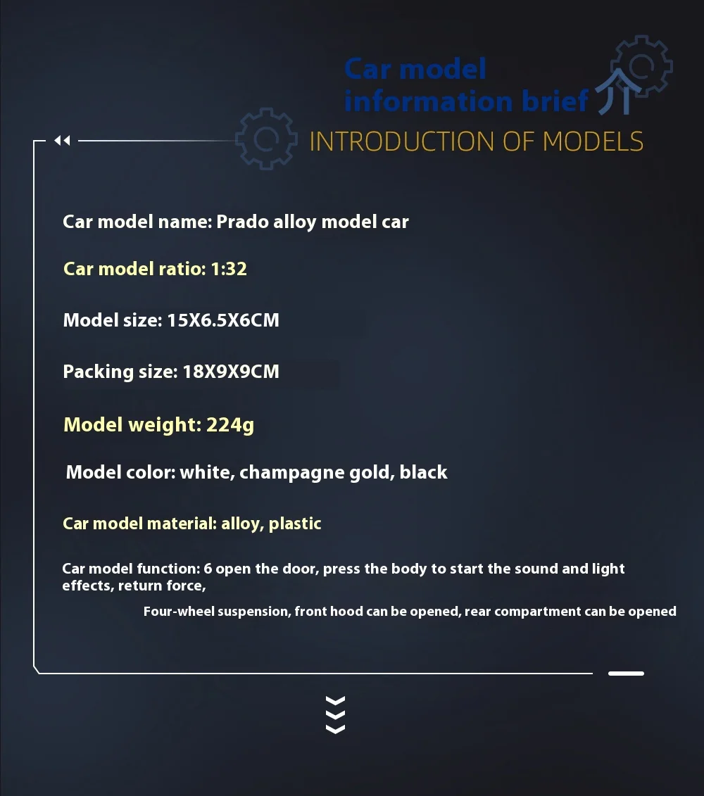 At a scale of 1:32, this diecast model offers an ideal size for display. It's compact enough to fit on any shelf, desk, or showcase without taking up too much space, yet large enough to showcase all of the fine details of the design. Whether displayed in a collection or used as a gift, the 1:32 Toyota Prado Land Cruiser will undoubtedly attract attention.