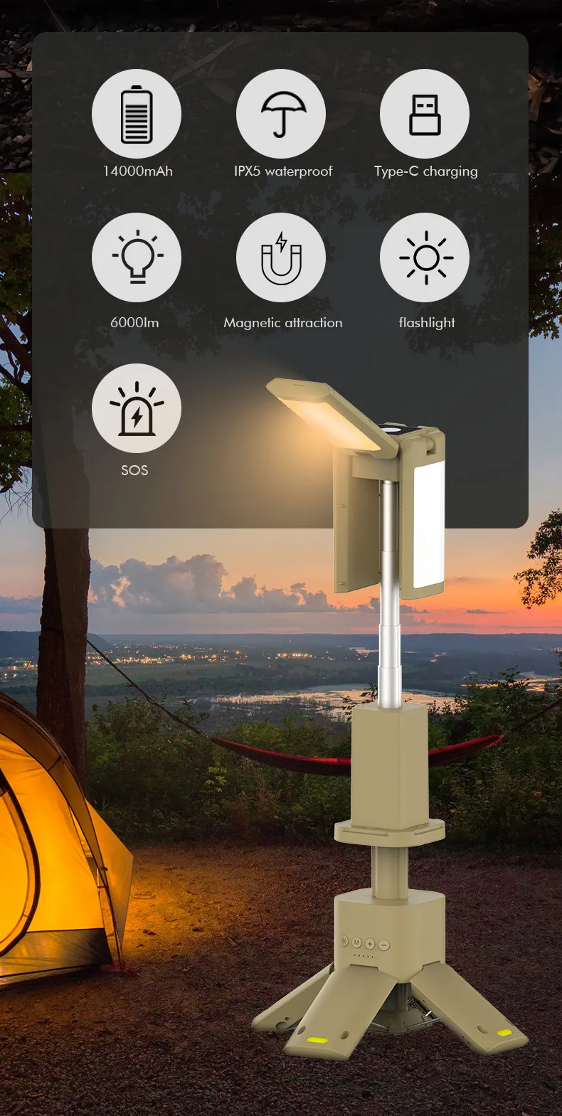 Embarking on outdoor adventures requires reliable equipment, and lighting is no exception. Introducing the 14000mAh Rechargeable Outdoor Hiking Fishing Tent Lamp, a super bright camping light designed to meet all your illumination needs. With its 6000 LM brightness, magnetic base, rotatable head, and telescopic LED design, this lantern is the perfect companion for camping, hiking, fishing, and RV trips. Let's delve into the features that make this rechargeable camping lantern an essential addition to your outdoor gear.