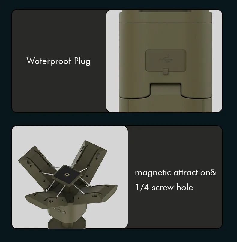 The lantern features a USB rechargeable lantern design, allowing you to charge it using a power bank, car charger, or solar panel. This flexibility ensures you can recharge the lantern wherever you are, providing peace of mind during extended trips.