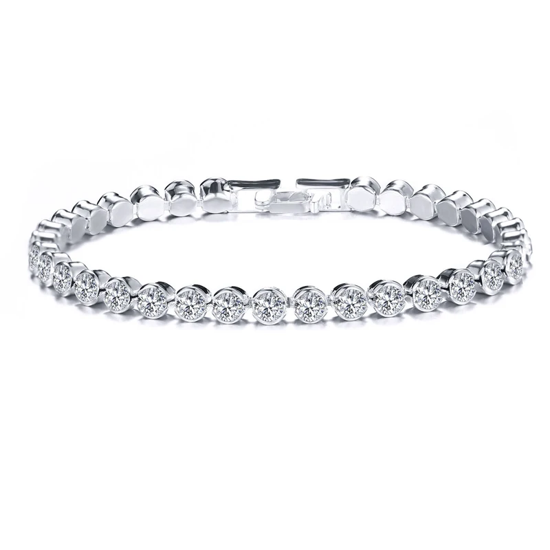 The tennis bracelet features a timeless design with a continuous row of cubic zirconia stones, offering a refined and polished look that complements any style.
