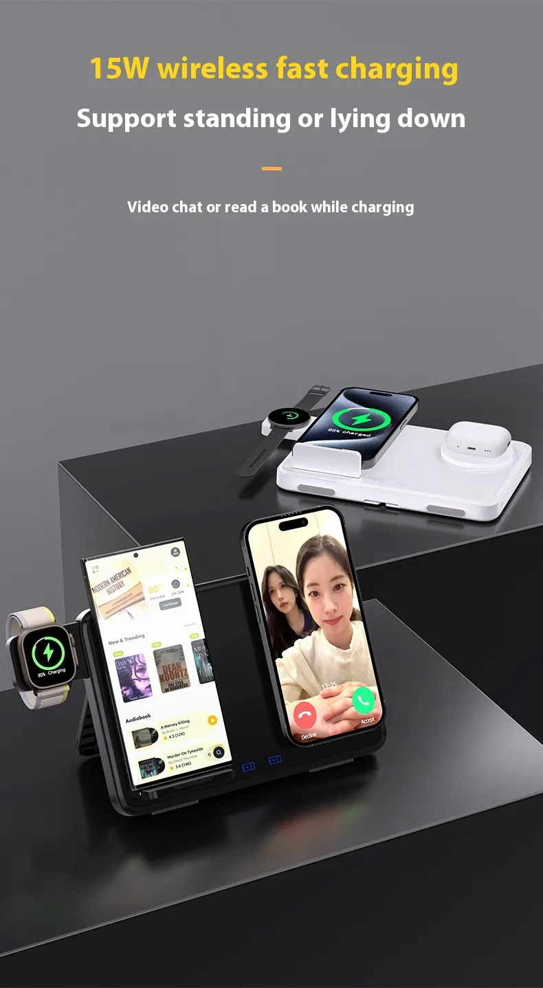 Upgrade to the 15W Three-in-One Wireless Charger and enjoy efficient, stylish charging for all your devices. Order now and experience the convenience of wireless power.