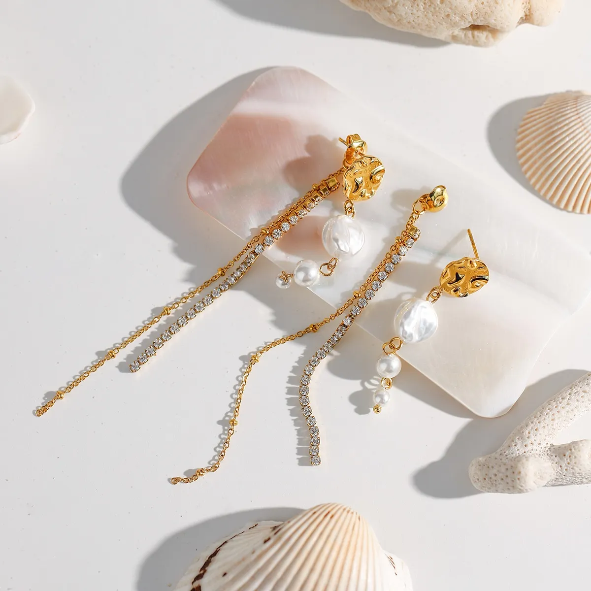 18K Dold Pearl White Zircon Claw Chain Tassel Earrings