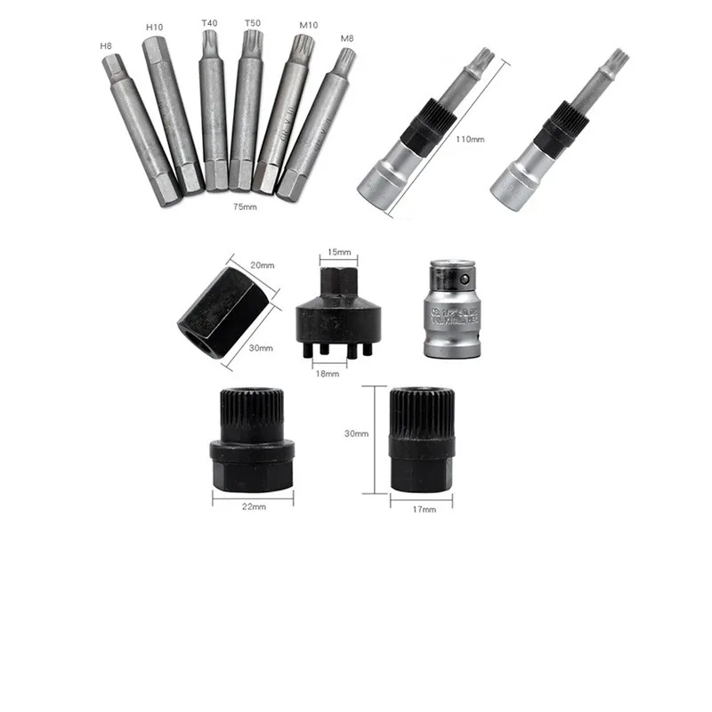 Items inside: 2 110 1/2 "screwdriver heads M10 T50, 6 75mmS2 screwdriver heads M8 M10 H8 H10 T40 T501 10mm 1/2" hexagonal socket, 4 special headers # 1 33T × 19.5mm,#2 33T x19.2mm,#3 Hex x22mm,#54p x30.2mm