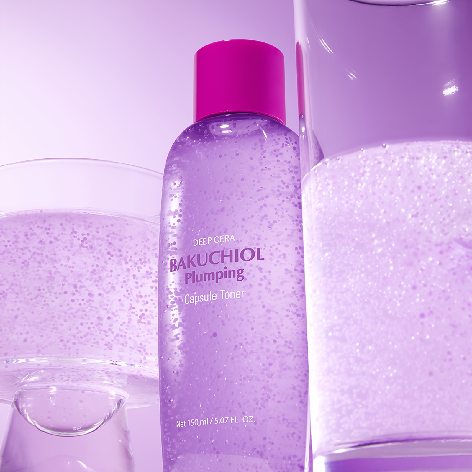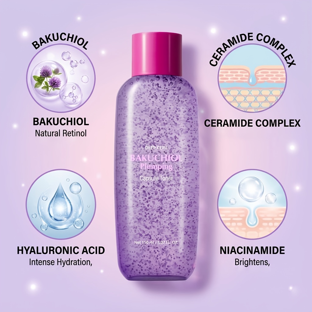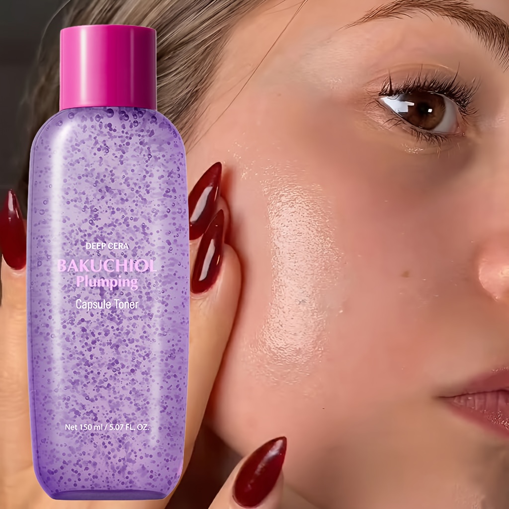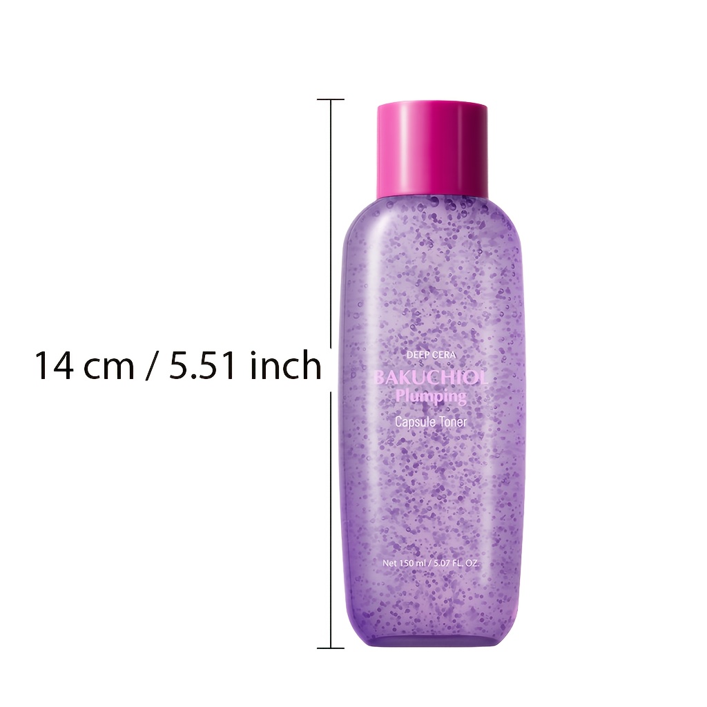 A hydrating, skin-plumping capsule toner designed to support a smoother-looking complexion, improved glow, and a stronger-feeling moisture barrier. The product shown is Deep Cera & Bakuchiol Plumping Capsule Toner in a 150mL / 5.07 fl. oz. bottle, featuring visible “capsule” beads suspended throughout the formula—often used to deliver a more nourishing, conditioning toner experience than traditional watery toners.
