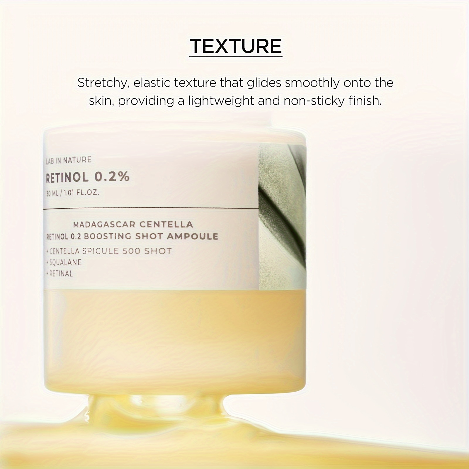 Meet the nightly “reset” step designed for people who want visible skin refinement without turning their routine into a complicated project. Lab in Nature Retinol 0.2% Boosting Shot Ampoule (also labeled Madagascar Centella Retinol 0.2 Boosting Shot Ampoule, 30ml / 1.01 fl. oz.) is a targeted treatment ampoule built around a modern, results-driven trio: Retinol (0.2%) + Retinal + Squalane, supported by Centella and a distinctive “Centella Spicule 500 Shot” concept intended to help the formula feel more “performance” than a standard retinol serum.