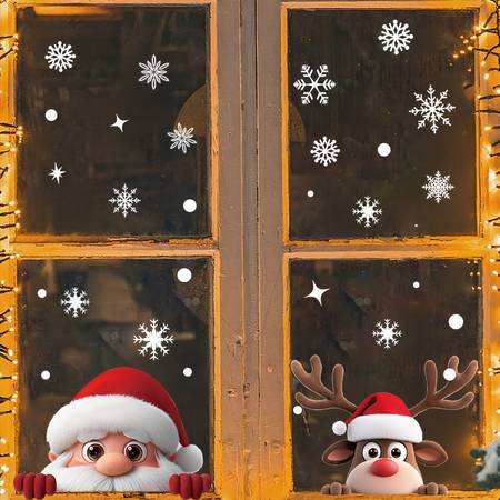 2 Sheets Cute Christmas Window Clings Santa, Reindeer & Snowflakes (Reusable Static Stickers)