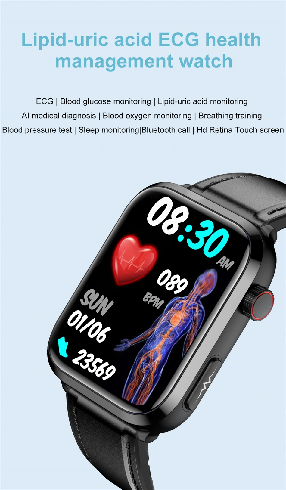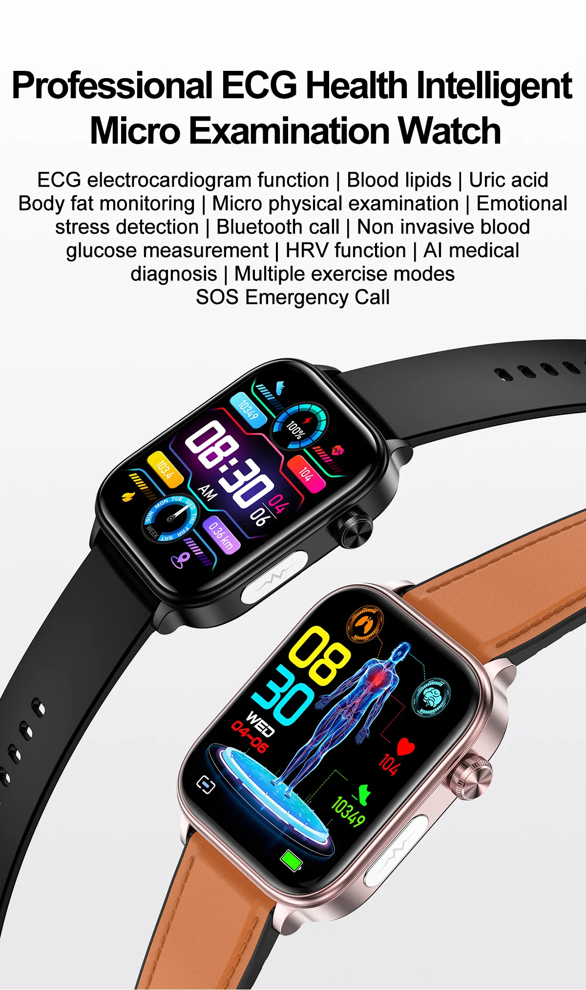 The 2024 AI Medical Diagnosis Smart Watch is a breakthrough device in health monitoring, designed to track vital metrics and provide medical insights right from your wrist. Featuring advanced AI technology, this smartwatch monitors blood lipids, uric acid, blood glucose, ECG, PPG, and more, delivering real-time health insights with medical-grade accuracy. It’s designed with integrated Bluetooth calling, allowing you to manage calls directly from the watch, and voice-enabled controls for hands-free operation. Perfect for health-conscious individuals and those managing specific health conditions, this smartwatch offers a complete health monitoring suite in a sleek, user-friendly design.