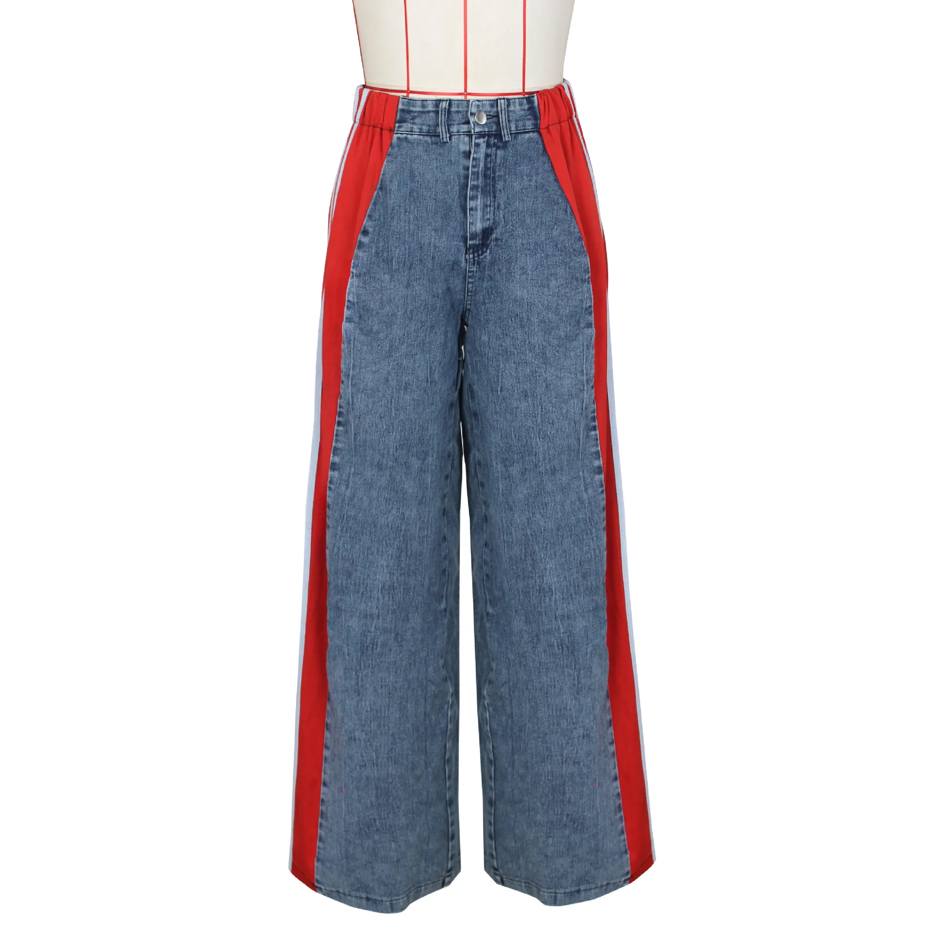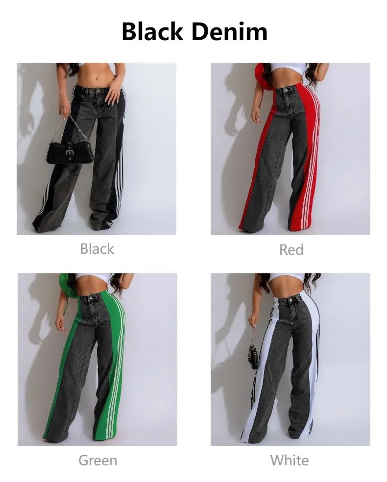 2024 Fashion Casual High Waist Elastic Straight Leg Trousers Three Stripe Patchwork Denim Wide Leg Pants Streetwear