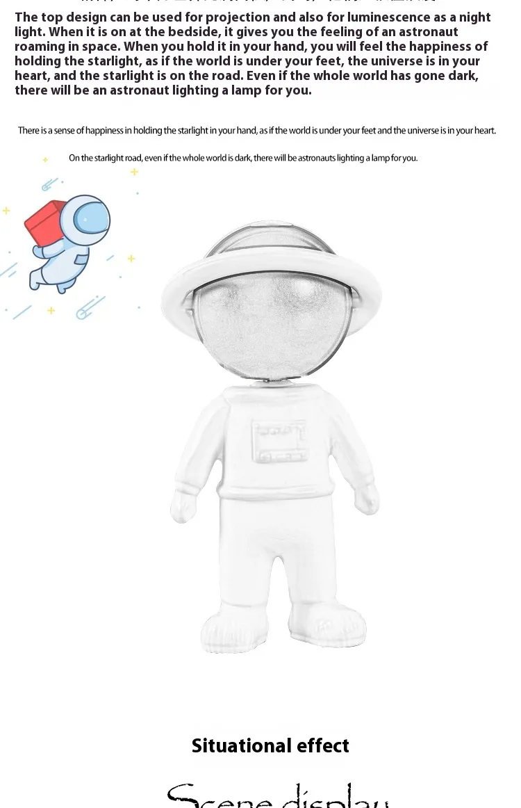 The 2024 Astronaut Star Projector Lamp is the ultimate way to add a magical and relaxing ambiance to your space. Whether you're using it as a night light, a fun bedroom decor piece, or for creating a calming atmosphere for children, this projector lamp brings the beauty of the night sky right into your home.