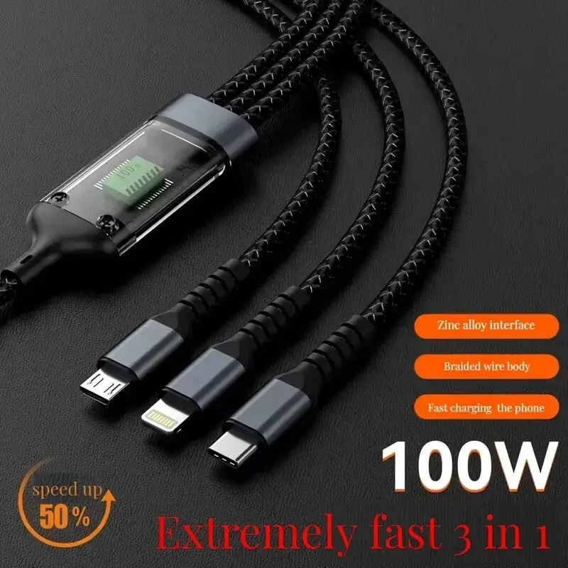 This 3-in-1 fast charging cable supports Type-C, USB, and Micro USB connectors, providing up to 100W power for quick charging. It is compatible with iPhone, Samsung, Huawei, Xiaomi, and other devices. The cable features a transparent design with a pilot lamp for easy use, delivering 6A current for efficient charging.