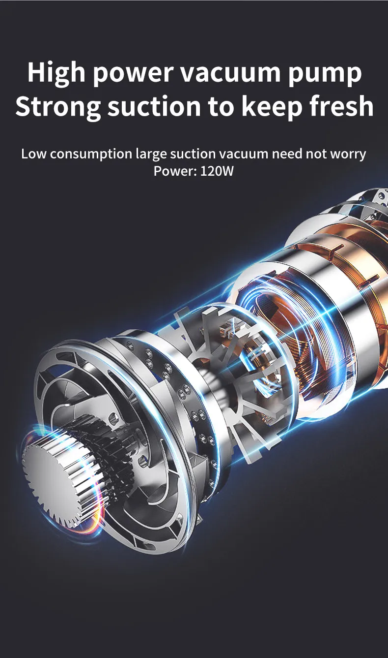 Vacuum sealing, airtight container air removal, and traditional sealing modes support versatile food preservation options.