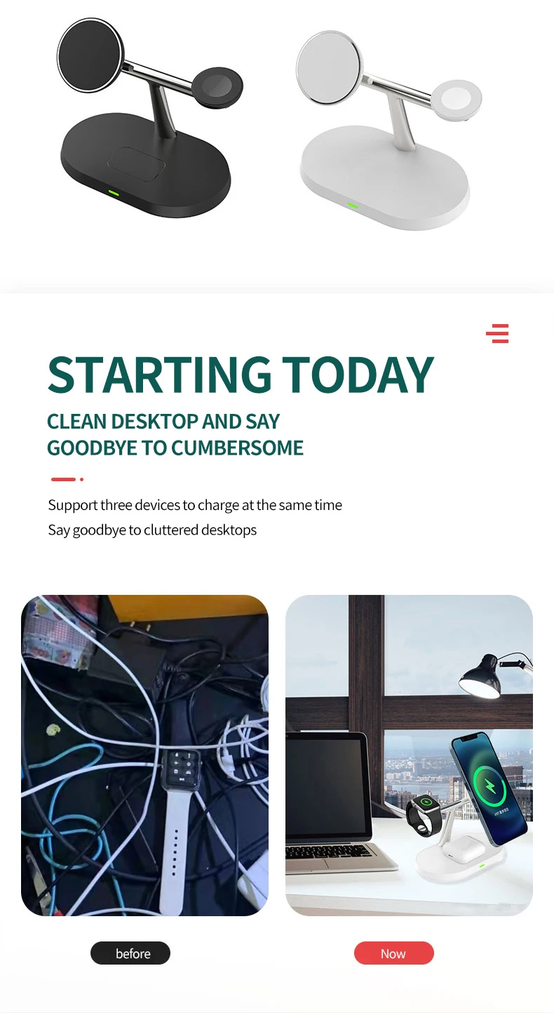 Conclusion The 3-in-1 Magnetic Wireless Charger Stand is a must-have accessory for anyone with multiple Apple devices. Its sleek design, fast charging capabilities, and secure magnetic alignment make it an efficient and stylish solution for keeping your devices powered up. Whether you're at home, in the office, or on the go, this charger stand provides a convenient and reliable way to charge your iPhone, Apple Watch, and AirPods.