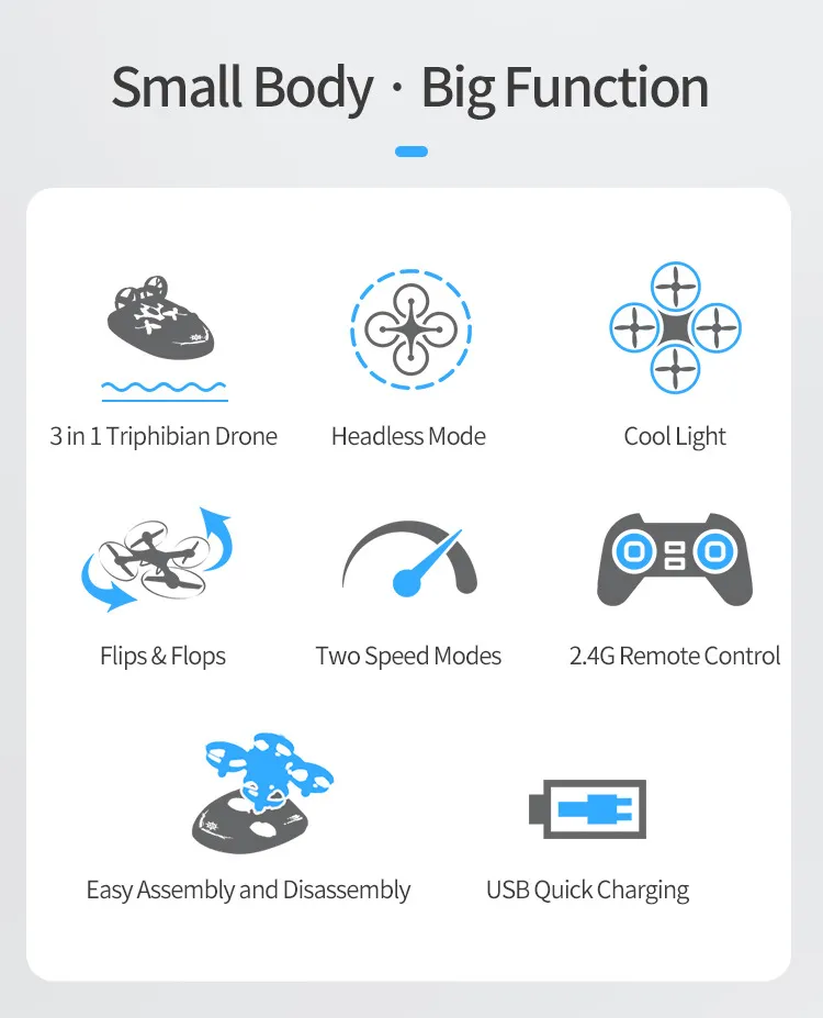 This compact drone features a durable, lightweight design with propeller guards for safety. Powered by a rechargeable battery and controlled via a responsive remote, it provides extended playtime with easy recharging through USB. Perfect for parks, backyards, or pools, the 3-in-1 Mini Drone offers an all-terrain experience for adventurous pilots.