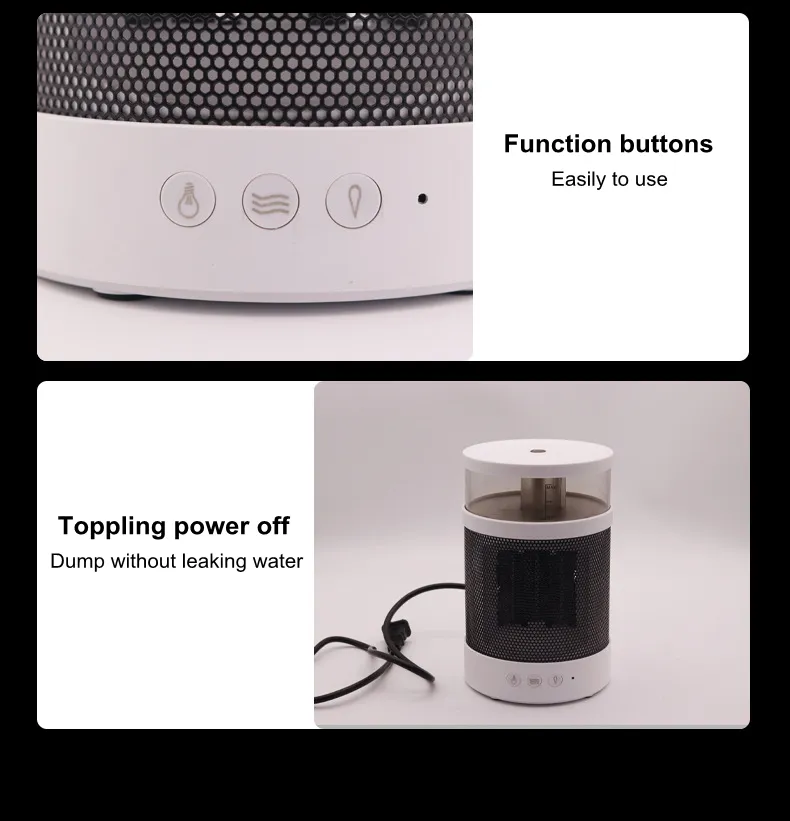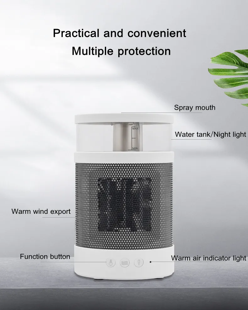 1. This space heater is a small one for indoor use that integrates humidification and heating. Heating will dry the skin, but with the humidification function at the same time, this problem can be well solved; the humidifier has 2 wind speed adjustments, and the heating temperature has 2 adjustments, you can choose according to your own needs; when the temperature reaches 45℃ the space heater will automatically turn off to avoid skin burns; the white appearance, if you are a beauty control, you will like this space heater.