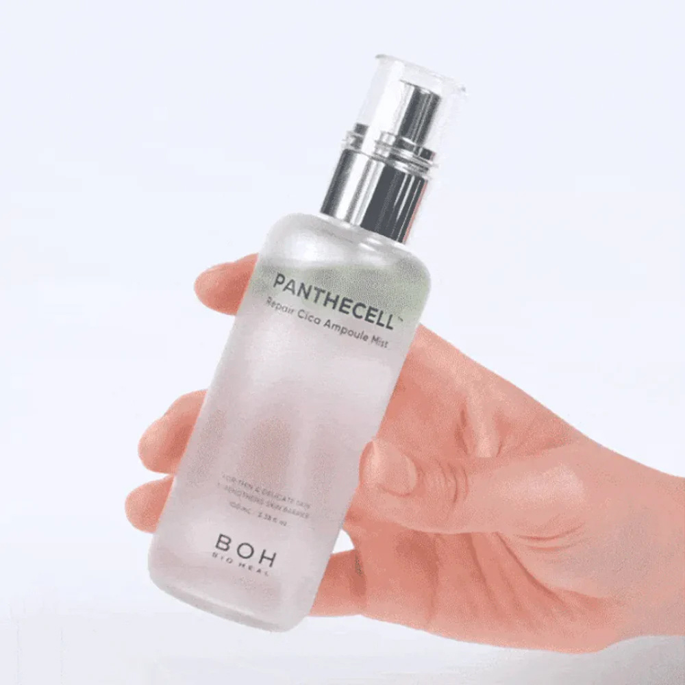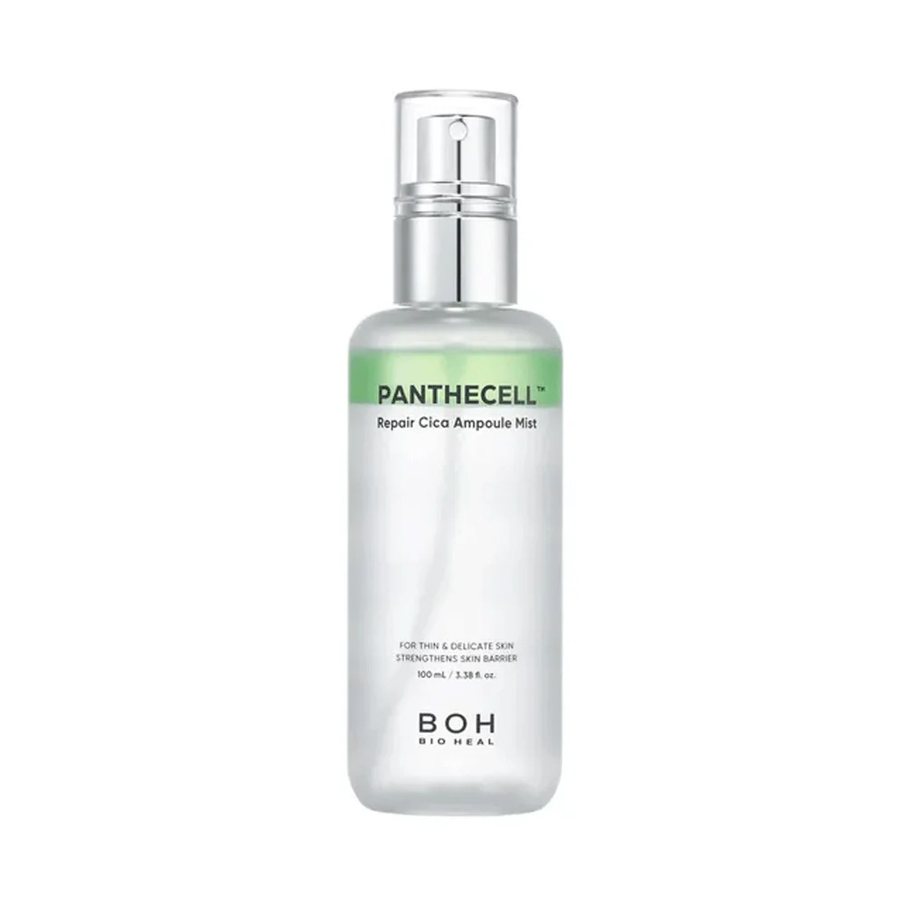 A lightweight, fine-spray ampoule mist designed to comfort and hydrate delicate-feeling skin while supporting a stronger-looking skin barrier. The product shown is PANTHECELL Repair Cica Ampoule Mist by BOH (Bio Heal) in a 100mL / 3.38 fl. oz. spray bottle. It is positioned for thin and delicate skin and promoted to strengthen the skin barrier, making it a versatile mist for daily hydration, redness-comfort routines, and post-active recovery days.