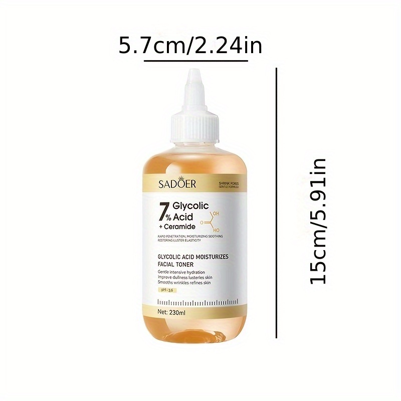 A multi-benefit exfoliating toner designed to support smoother-looking texture, improved radiance, and a more refined appearance of pores—while still focusing on hydration comfort. The product shown is SADOER 7% Glycolic Acid + Ceramide Facial Toner in a 230mL bottle, promoted for moisturising, anti-wrinkle support, and soothing to improve dryness and dullness.