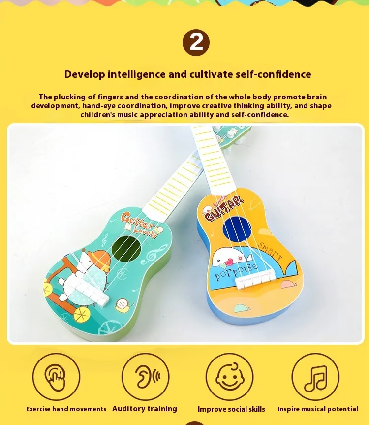 practice simple strumming and plucking, helping to develop hand-eye coordination, rhythm, and fine motor skills. Learning to play basic