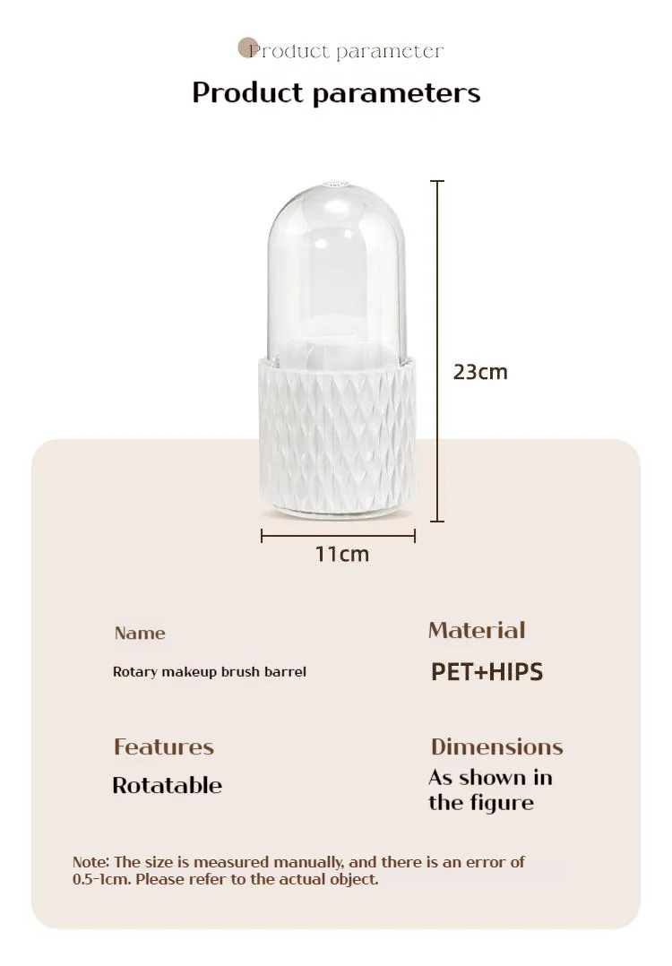 The 360 Rotating Makeup Brush Storage is designed to hold a large number of brushes, from full-size face brushes to smaller precision tools. With multiple compartments, it ensures that each brush has its designated place, keeping them organized and protected. Whether you own an extensive collection of brushes or prefer to keep a few essentials, the large capacity accommodates brushes of all sizes, as well as other small beauty tools like makeup sponges or eyebrow pencils.Benefits: