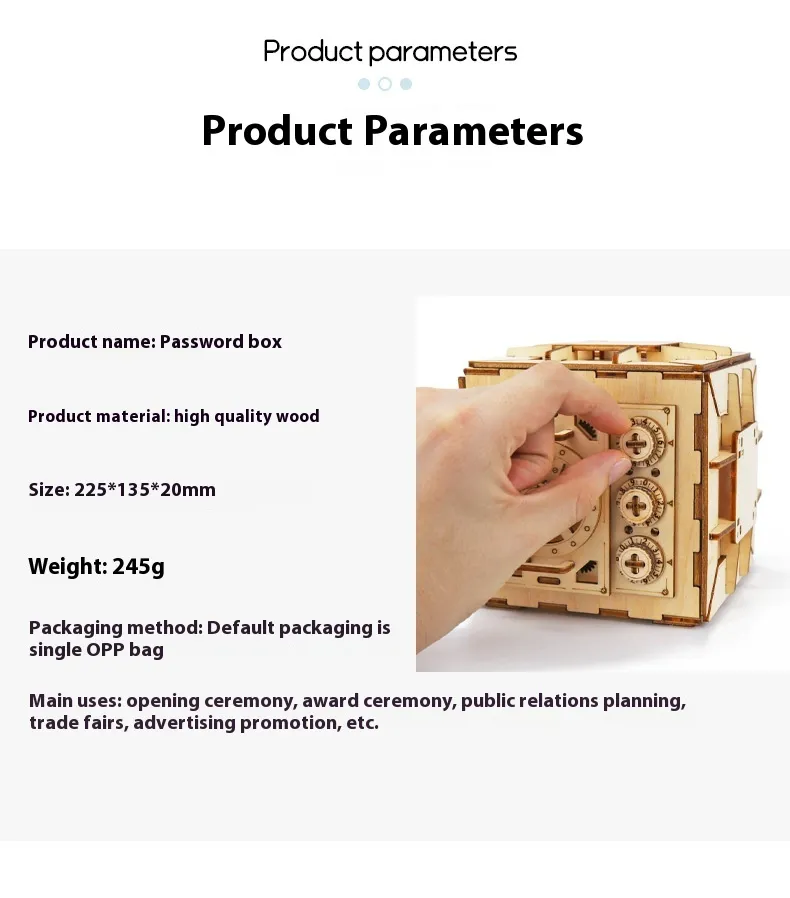 The 3D Puzzle Model Password Suitcase is more than just a puzzle – it’s a creative project that combines the challenge of assembling a functional storage box with the fun of solving a puzzle. Its high-quality wooden materials, detailed design, and password-lock feature make it a standout item for puzzle lovers and DIY enthusiasts. Whether you're looking to challenge your mind, create a unique decoration, or find a functional storage solution, this 3D puzzle has it all.
