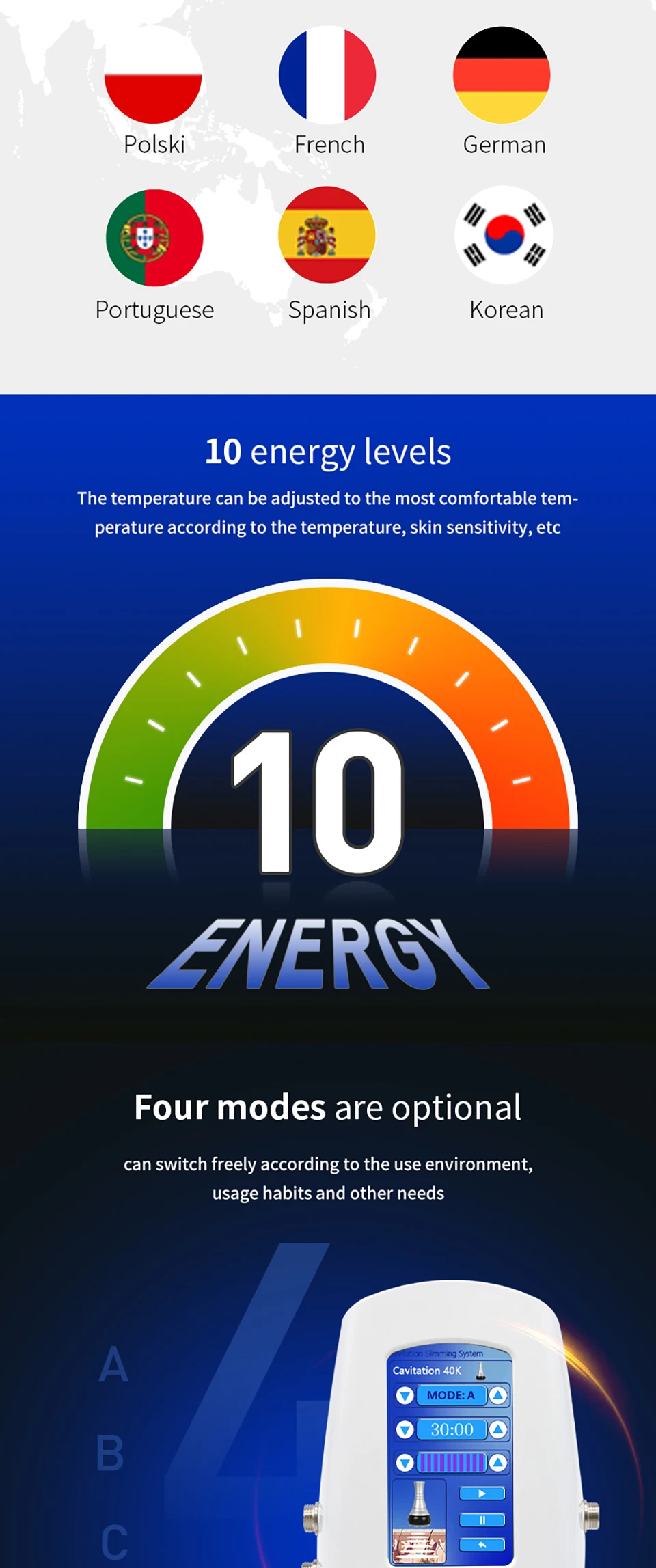 The 3-in-1 40K ultrasonic cavitation RF beauty instrument is available in nine languages: Chinese, English, Russian, Polish, Spanish,