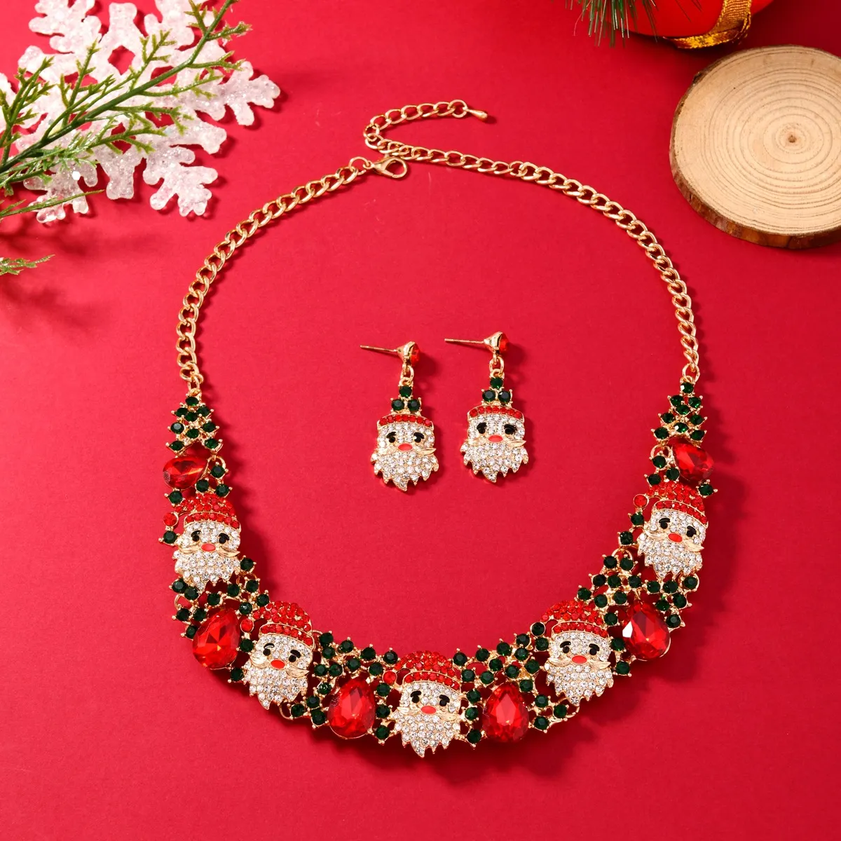 3pcs Christmas Necklace Earrings Set With Colored Rhinestones Ins Fashionable Shiny Santa Claus Necklace For Womens Jewelry