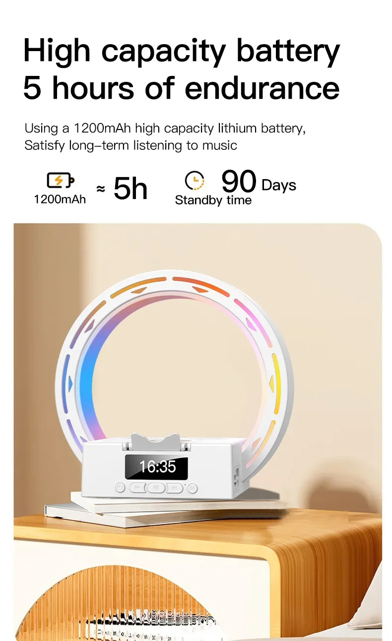 The 4-in-1 design of this device ensures that it serves multiple purposes, reducing clutter and adding convenience to your bedroom setup. It functions as a wireless Bluetooth speaker, a wireless charging pad, a bedside lamp, and an alarm clock with a wake-up light feature. This all-in-one solution is designed to enhance your daily routine and improve your sleep quality. The elegant and modern design fits seamlessly into any bedroom decor, making it a stylish addition to your space.