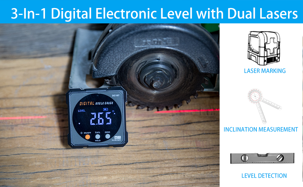 DUAL LASER GUIDE AS A LEVEL – The integrated laser feature provides an additional visual reference point, improving accuracy when measuring or aligning angles, especially for larger projects or when working in low-light conditions.