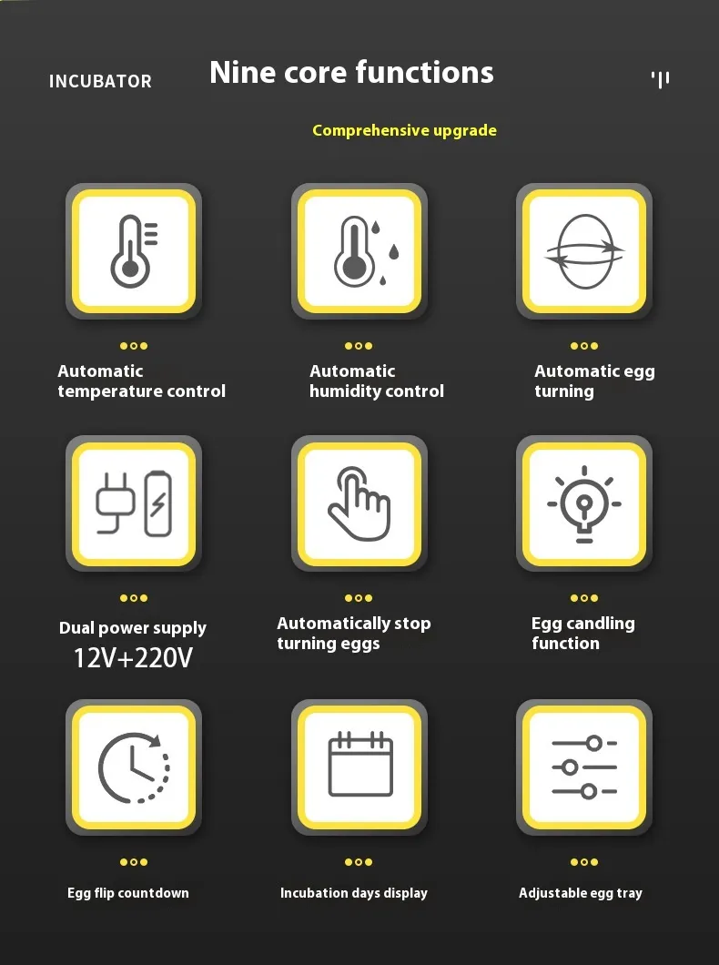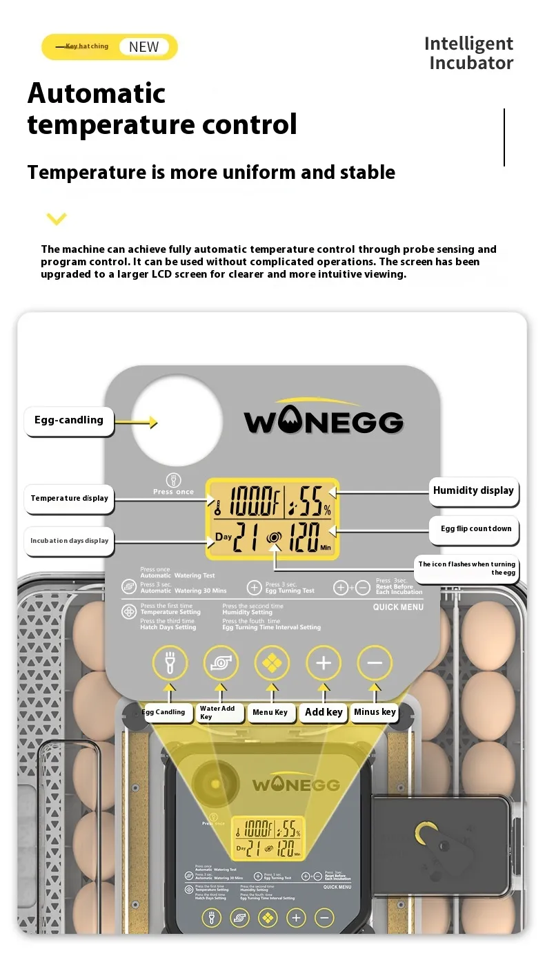 This automatic incubator is equipped with advanced temperature and humidity control systems to create a stable environment, essential for the healthy development of your eggs. The automatic egg-turning function helps ensure even rotation for all the eggs, increasing the hatch rate. The clear digital display lets you monitor and adjust settings easily, while the energy-efficient design ensures you can operate it without high energy costs.