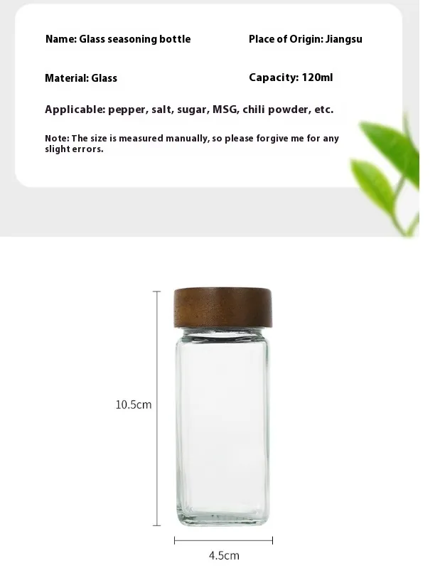 This square-shaped glass bottle holds up to 120ml (approximately 4oz) of your preferred seasonings such as cumin, pepper, barbecue rubs, or granules. The scattering top ensures even distribution, making it easier to control the amount of spice applied. The natural acacia wood lid adds an eco-friendly, aesthetic touch while providing a secure seal to preserve freshness.