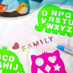 The drawing mat is printed with alphabet letters in eye-catching animal shapes, colorful shapes,number templates and geometric