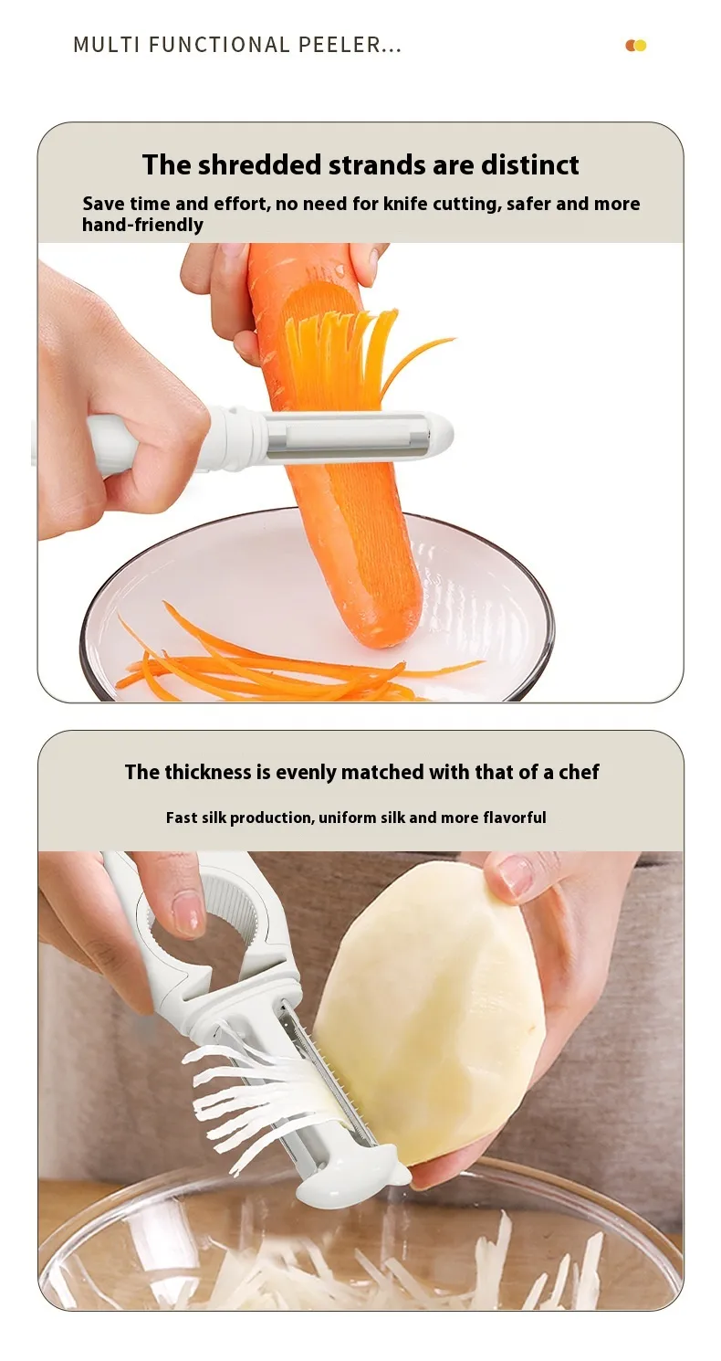Upgrade your kitchen with the 5-in-1 Fruit and Vegetable Peeler, a multifunctional kitchen gadget designed to save time and effort. Made from food-grade stainless steel, this versatile tool not only peels fruits and vegetables with precision but also functions as a bottle opener, julienne cutter, and more. Whether you're a home cook or a culinary enthusiast, this dishwasher-safe kitchen essential is perfect for simplifying meal prep.