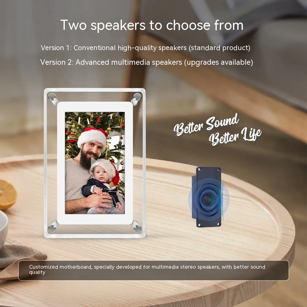 Features: transparent material, multimedia stereo speaker, automatic rotation playback, plug-and-play mode/battery independent playback mode
