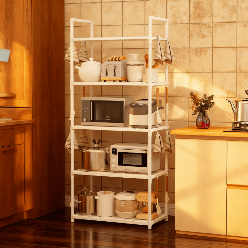 Its adjustable shelf design allows you to customize the height of each tier to fit everything from small kitchen essentials to larger appliances or storage bins. Whether placed in the kitchen, pantry, garage, or utility room, this shelving unit delivers reliable performance with a clean, modern look.