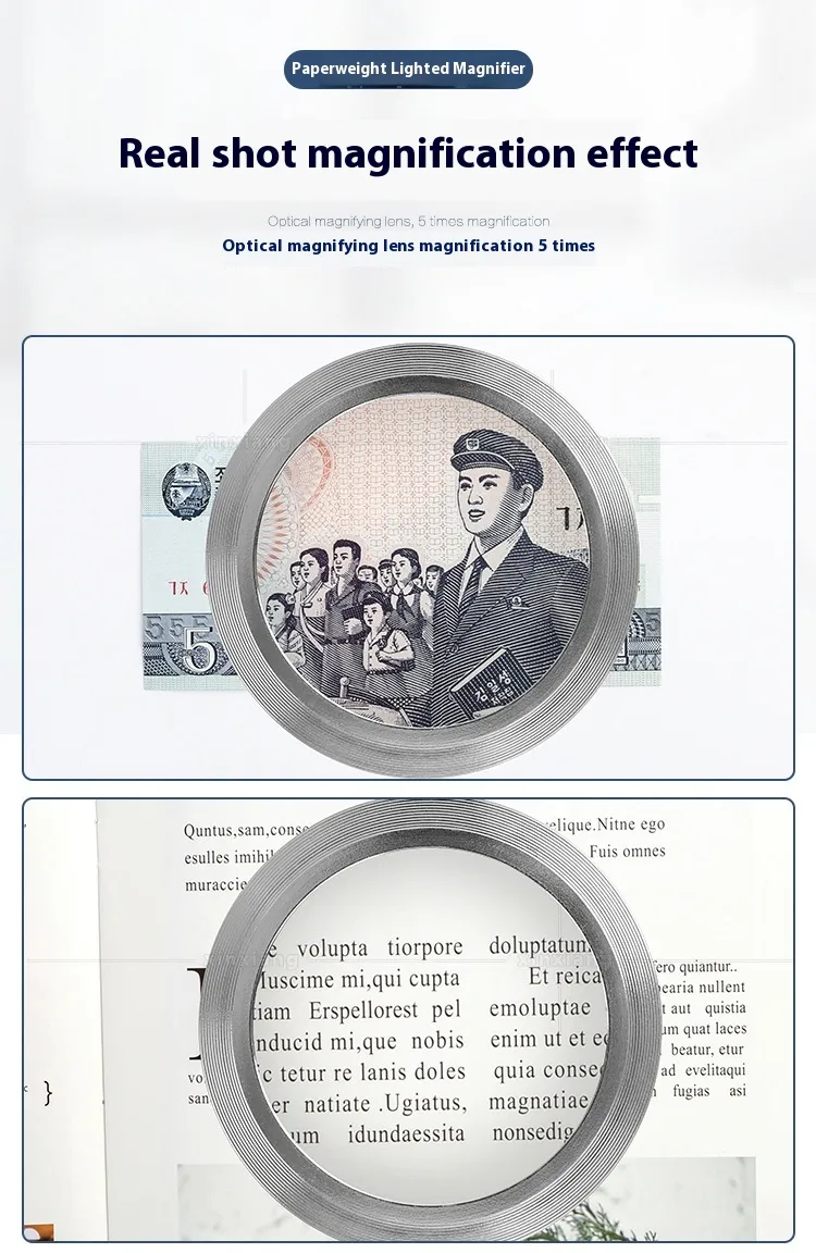 Enhance your reading and detail-oriented tasks with the 5 Times Cylinder Reading Magnifier, featuring high-quality K9 optical glass and built-in LED lighting. Designed for clarity, convenience, and elegance, this magnifier is perfect for anyone who values precision, whether for reading small text, examining intricate details, or engaging in hobbies like stamp collecting and crafting.