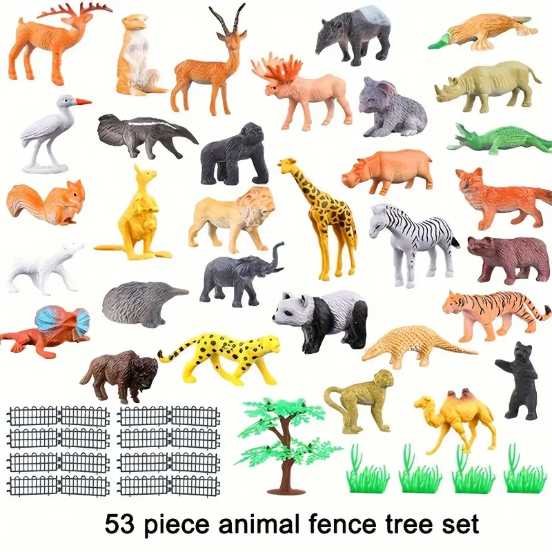 53pcs Mini Jungle Animal Figurines Set - Educational Puzzle & Playset with Fence and Trees for Birthday, Christmas, and Party Learning