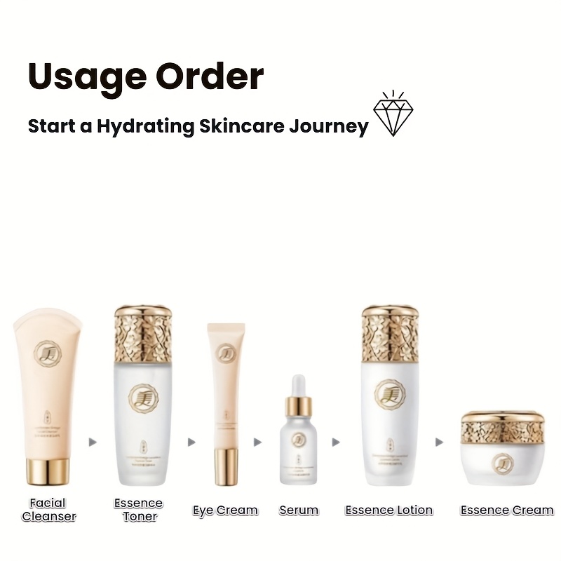 Complete 6-Step Routine: Cleanser, Toner, Eye Cream, Serum, Lotion, Cream.
