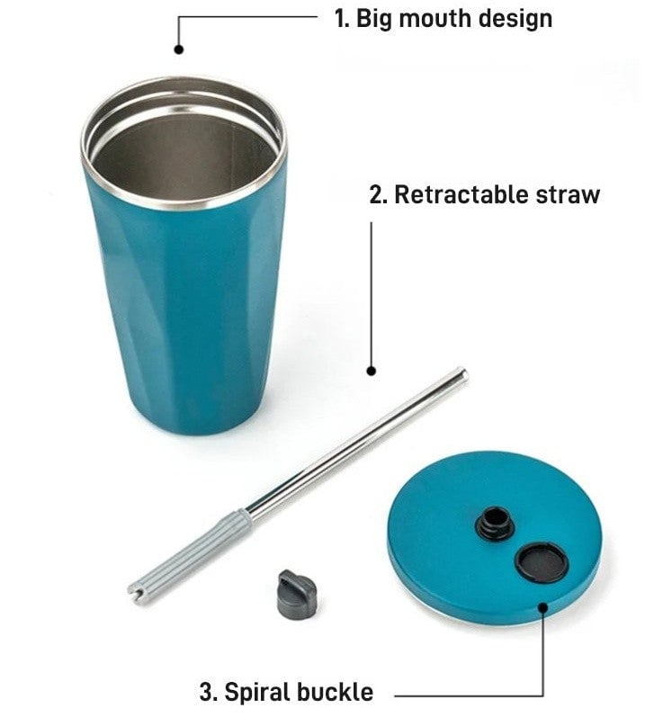 Coffee Cup with Straw and LidĀ - A retractable straw, with silicone part at the bottom. This allows theĀ straw to retract back into the mug when not in use or bounce out of straw hole when in use. The lid of the cup is designed to a spiral buckle, and hasĀ a straw hole with a lid. The straw lid is designed to fit onto a specially equipped lid buckle when straw is in use, and screwed onto the straw hole when straw is not in use.
