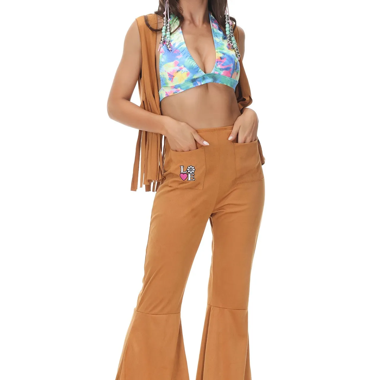 The 70s were also a time of peace, love, and free expression. Bohemian-inspired 70s costumes feature flowy, flower-printed dresses, peasant blouses, fringed vests, and wide-brimmed hats. Add accessories like peace sign necklaces, headbands, and round sunglasses to achieve the full hippie vibe.