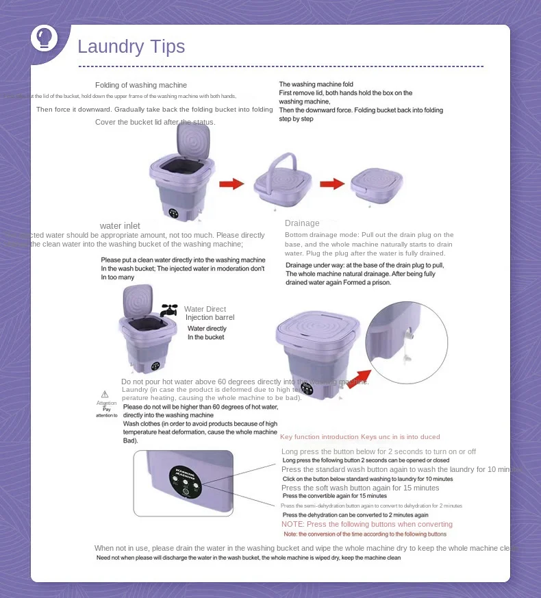 The 8L Portable Foldable Washing Machine with Spin Dryer is designed to cater to various lifestyles and needs. Its compact, foldable design and efficient features make it suitable for small living spaces, travel, or as a supplemental washer for handling small loads. This mini washer is an excellent choice for anyone looking to save space, time, and resources without compromising on cleanliness and convenience.