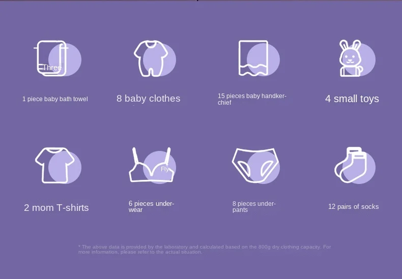 One washable: 1 baby bath towel&8 baby clothes&15 baby sweaters&4 small toys&2 mother T-shirts&6 underwear&8 underwear&12 pairs of socks (Above data provided by the laboratory to 800 g driven cloths capacity calculation, specific please refer to our actual.)Â Â