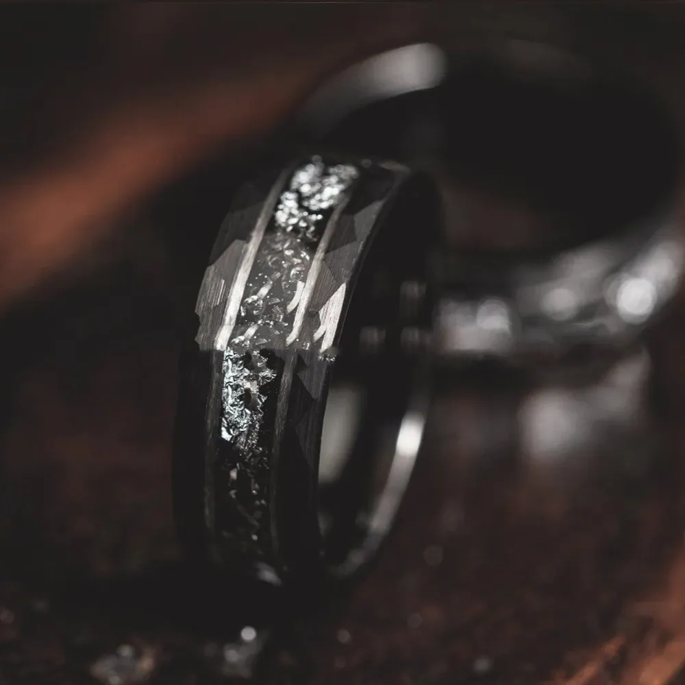 The steel-colored inner band offers contrast and comfort, while inlaid iron chips and shimmering silver foil add a distinct metallic flair — making it not just a ring, but a statement. Constructed from high-grade tungsten carbide, this ring is not only visually striking but also highly durable, scratch-resistant, and built to last a lifetime.
