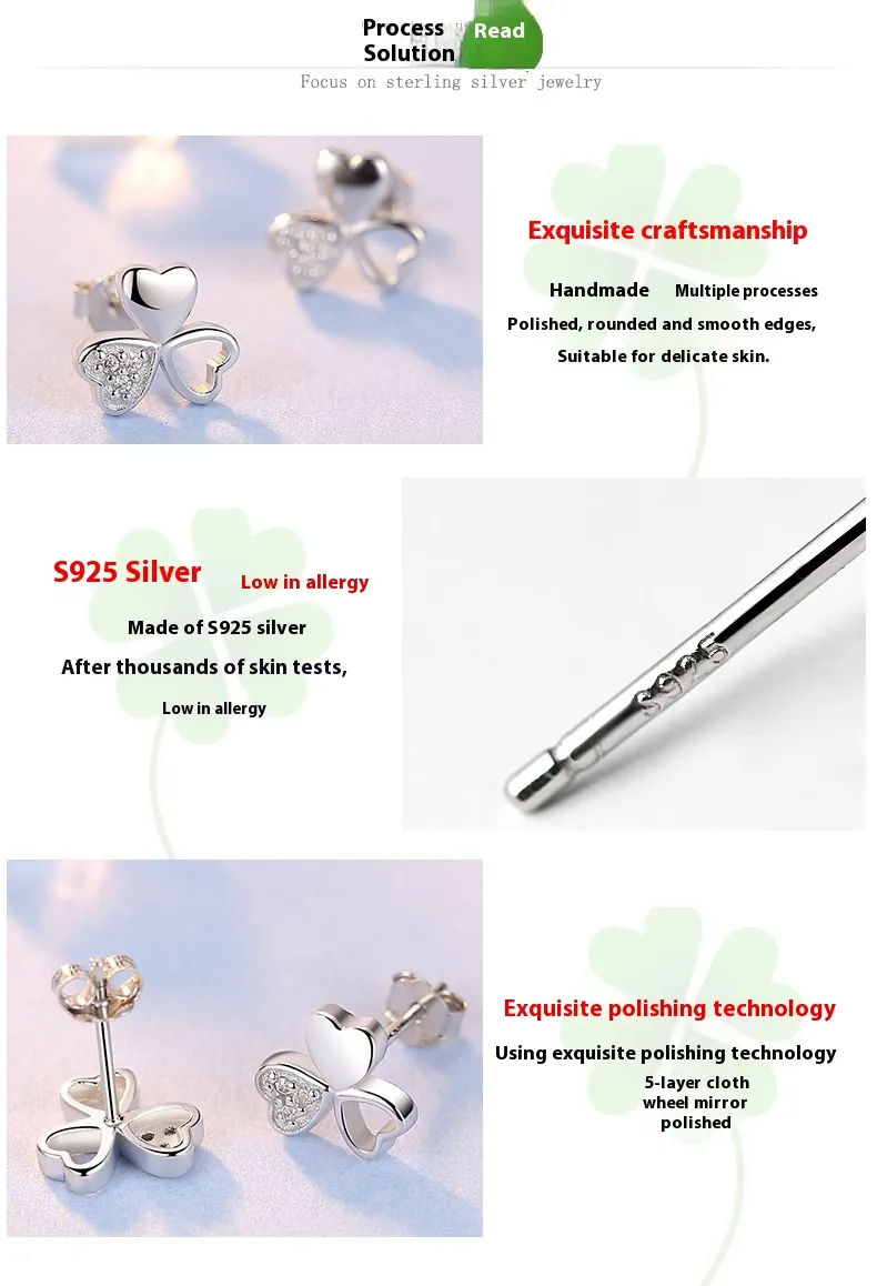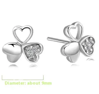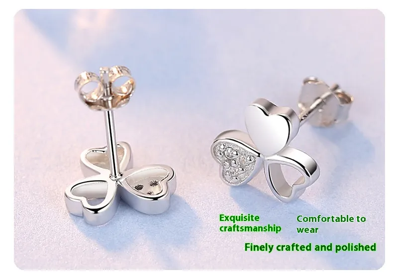 925 Silver Lucky Clover Zircon Stud Earrings Flower Cute
