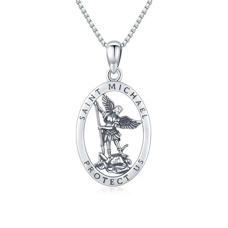 925 STERLING SILVER PENDANT AND 20" BOX CHAIN -- The piece features Saint Michael holding the sword to conquer Santa, with the words" Saint Michael Protect US" along the border. both pendant and chain fashioned in 925 sterling silver, nickel-free, lead-free, low sensitivity and oxidation resistance, could be worn for a long time without discoloration, ALSO FOR SENSITIVE SKIN.