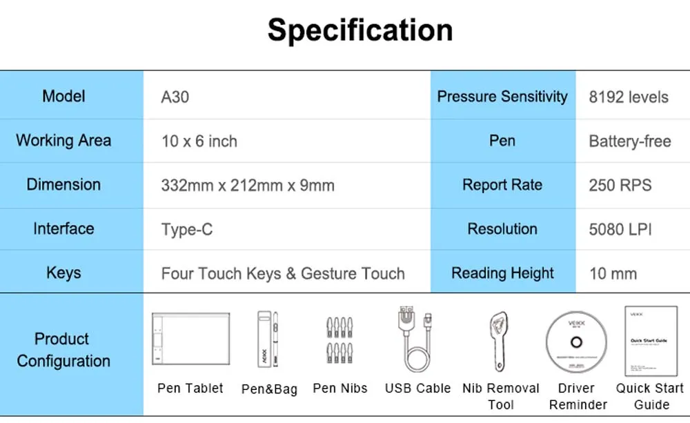 Drawing Tablet VEIKK A30 with Passive Stylus 8192 Levels